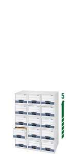 Stacks 5 high - The higher the drawer system stacks, the more space, time and money you save. Includes removable rails for hanging files. Steel support frame reinforces heavy-duty corrugate for added durability. Reinforced plastic handle for easy drawer access.